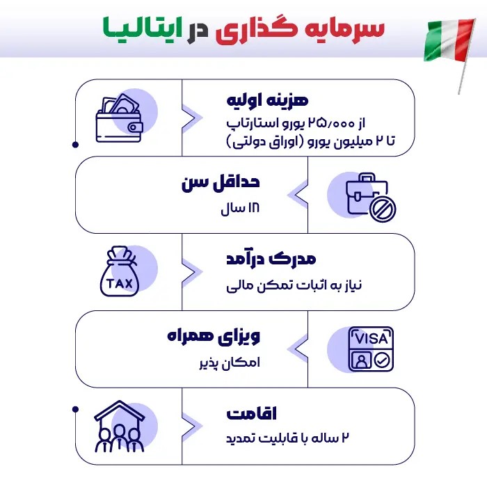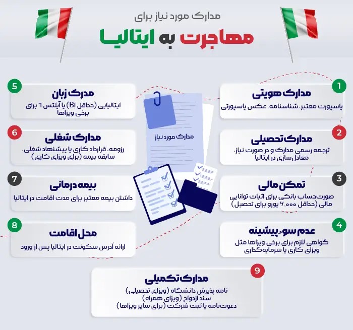 - تمکن مالی: مدارک درآمد غیرفعال/مستمر، اجارهنامه/ملک در ایتالیا.