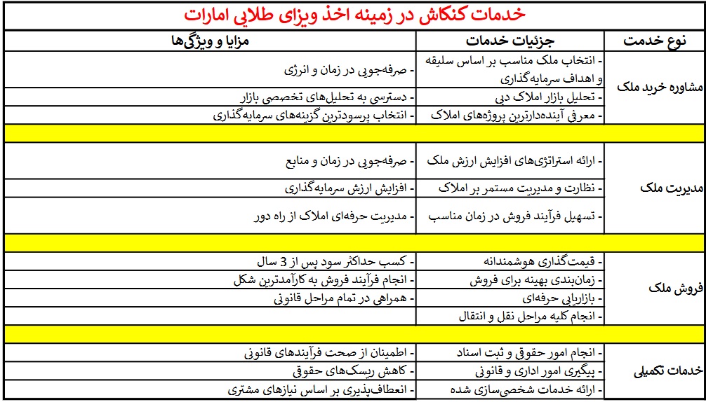 - حوزهها: مهاجرت کاری، تحصیلی، سرمایهگذاری و ثبت شرکت در دبی