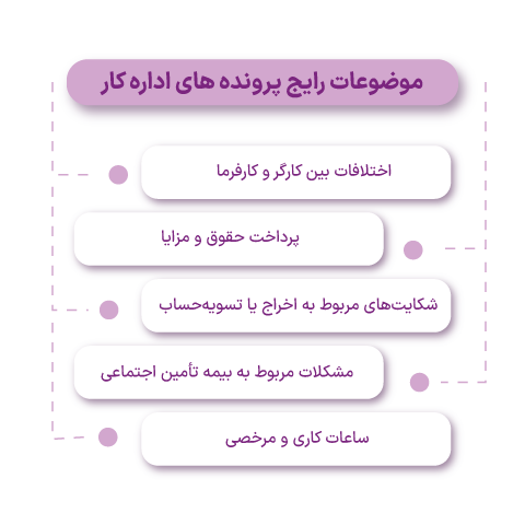 - اعتراض به آراء: هیأتهای تشخیص/حل اختلاف اداره کار، شعب بدوی/تجدیدنظر تأمیناجتماعی، دیوان عدالت اداری.